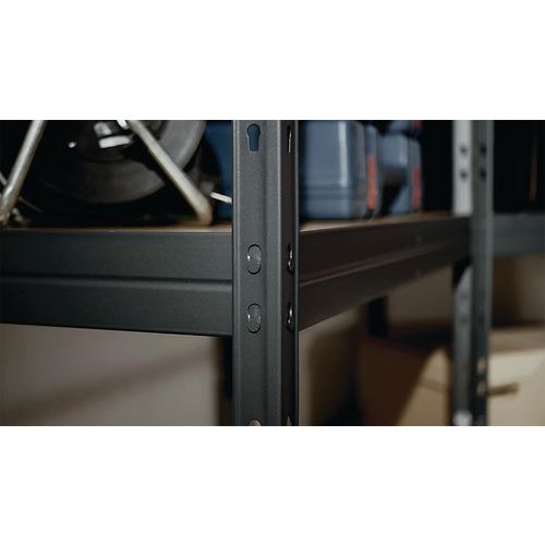 Estantería industrial para el almacenamiento de cargas ligeras y medias con 250 kg por nivel. Resistente: fijación segura de las uniones con doble remachado, 2 refuerzos por nivel debajo del tablero. Disponible en varias dimensiones y 3 acabados de calidad (pintura epoxi o acero galvanizado). Estantería de montaje modulable: 1 tramo alto o 2 tramos bajos uno al lado del otro. Color RAL: azul 5010, antracita 7016. Tablero de aglomerado HDF de muy alta densidad. Estantería de almacenamiento muy fácil, no necesita herramientas específicas.