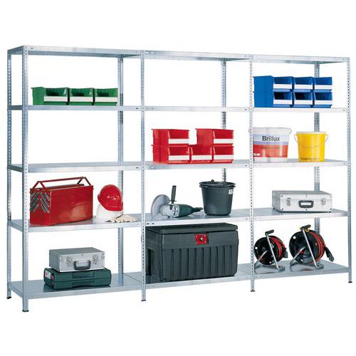 Estantería robusta y económica para almacenes y talleres. Ajustable a cualquier altura con incrementos de 25 mm. Fácilmente ampliable añadiendo 1 o más de los siguientes elementos. Acabado resistente a los golpes con acabado de epoxi gris o galvanizado. Estantería de montaje fácil y rápido.