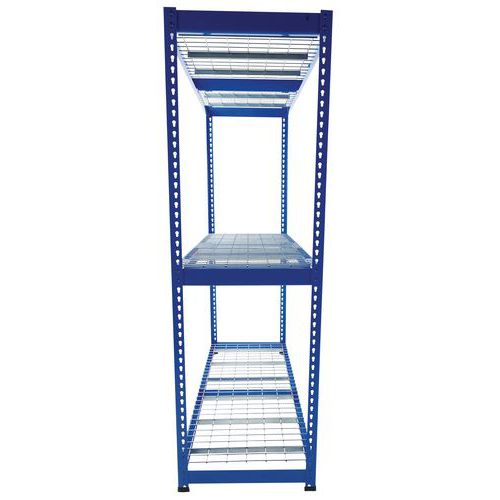 Estantería industrial sencilla y ultrarresistente para almacenamiento de mercancías pesadas. Balda de rejilla ideal para el almacenamiento ventilado y/o en una zona de almacenamiento equipada con aspersores. Acabado galvanizado para zonas húmedas o pintura epoxi, gris o azul, para entornos secos. Estantería de almacenamiento de montaje fácil y sin ayuda de técnicos y herramientas específicas.
