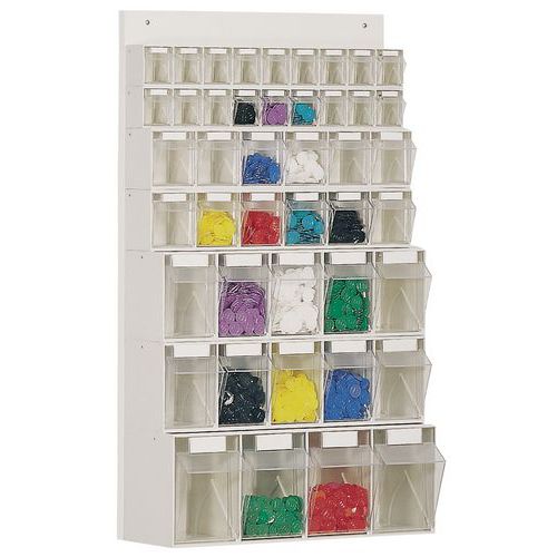 Cajas inclinables: 2 x 9 cajas y 2 x 6 cajas. Dimensiones de la fila de 9 cajas: 66x51x77 mm Dimensiones de la fila de 6 cajas: 100x75x113 mm Producto suministrado con etiquetas.