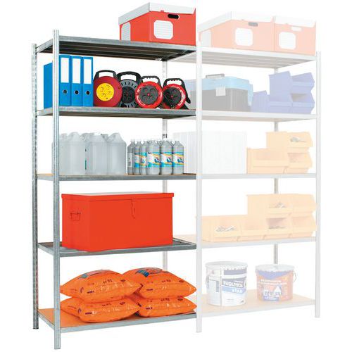 Sólida estantería de acero con estructura tubular para almacén. Estantería estable sin refuerzo en cruz para facilitar el acceso por ambos lados (2 caras). Montante con perforaciones en T (40x37 mm) no visibles por el frontal. Acabado epoxi o galvanizado: resistencia a golpes, rayas y humedad. Pie de plástico bajo el montante: buena estabilidad del conjunto y protección del suelo. Balda tubular totalmente soldada, con 4 conectores de excusa a los extremos. Ideal para almacenes, garajes y talleres.
