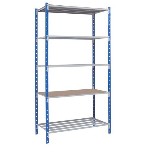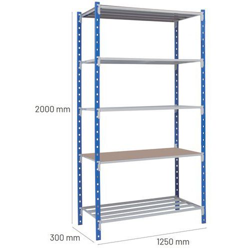 Sólida estantería de acero con estructura tubular soldada. Estantería estable sin refuerzo en cruz para facilitar el acceso simple o por ambos lados. Montante con perforaciones en C de 40x20x10x1,5 mm. Bonito acabado en pintura epoxi de color azul o gris: resistencia a golpes y rayas. Pie de plástico bajo el montante: buena estabilidad del conjunto, protección del suelo. Balda tubular totalmente soldada, con 4 conectores de excusa a los extremos. Ideal para almacenes, garajes y talleres.