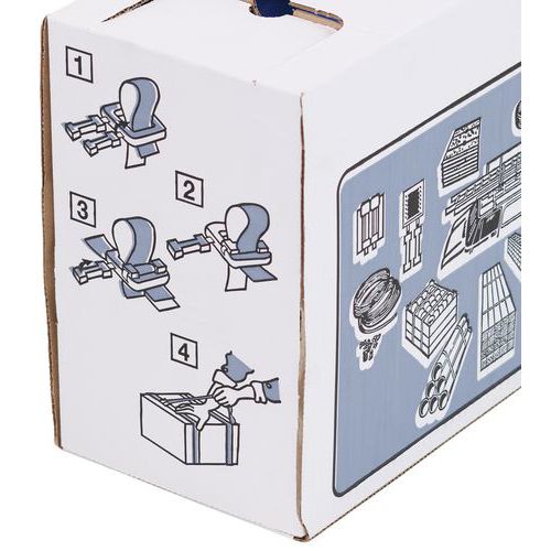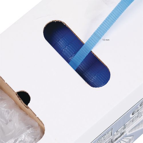 | Nombre del producto | Estuche de flejado PP azul, Fleje longitud: 600 m, Anchura Fleje: 12 mm, Modelo: Caja dispensadora |