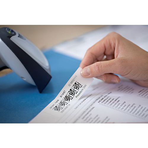 Etiqueta de papel autoadhesiva Dymo especial dirección para etiquetadora LabelWriter. Etiqueta precortada en rollo, ideal para imprimir números, sin atascos. Impresión térmica para una presentación clara, fácil de leer y sin rebabas. Etiquetado sencillo con una aplicación rápida y precisa, etiqueta fácil de despegar.