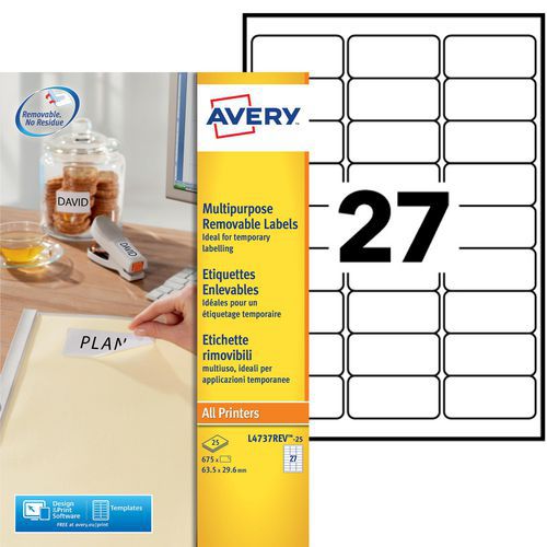 Etiqueta blanca reposicionable Avery, N.º de etiquetas/plancha: 27, Nº de etiquetas: 675