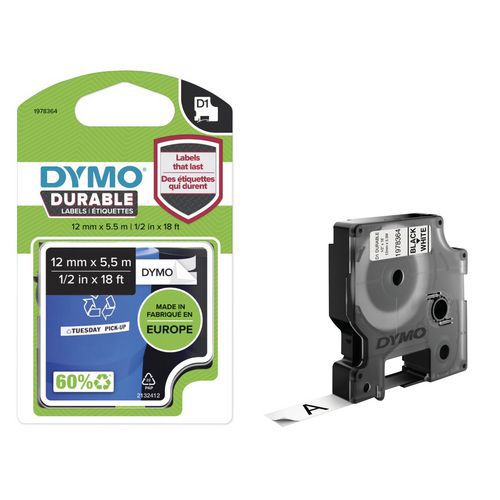 Etiqueta resistente D1, Cinta anchura: 12 mm, Fondo color: Blanco, Cinta longitud: 5.5 m, Material: Poliester Etiqueta resistente D1, Cinta anchura: 12 mm, Fondo color: Blanco, Cinta longitud: 5.5 m, Material: Poliester