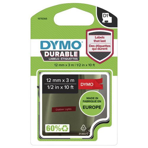Etiqueta resistente D1, Cinta anchura: 12 mm, Fondo color: Rojo, Cinta longitud: 3 m, Material: Poliester Etiqueta resistente D1, Cinta anchura: 12 mm, Fondo color: Rojo, Cinta longitud: 3 m, Material: Poliester