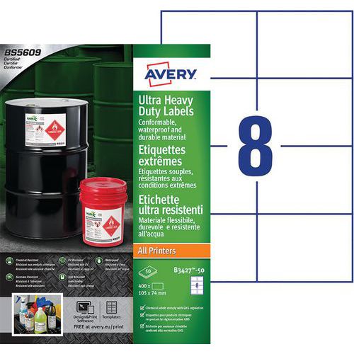 Etiqueta flexible de alto poder adhesivo resistente a condiciones extremas. Material estirable: adecuado para un marcado sobre superficies cuevas y/o rugosas. Resiste temperaturas de -40°C a + 150°C, a la suciedad, productos químicos, disolventes, rayos UV. Certificada BS5609 Parte 2 (resistencia de la etiqueta y del adhesivo), y aprobada para el etiquetado de productos químicos peligrosos. Compatible con todas las impresoras láser, inyección de tinta o copiadoras.
