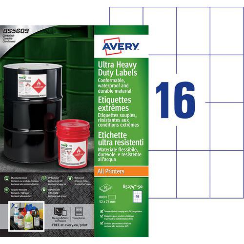 Etiqueta flexible de alto poder adhesivo resistente a condiciones extremas. Material estirable: adecuado para un marcado sobre superficies cuevas y/o rugosas. Resiste temperaturas de -40°C a + 150°C, a la suciedad, productos químicos, disolventes, rayos UV. Certificada BS5609 Parte 2 (resistencia de la etiqueta y del adhesivo), y aprobada para el etiquetado de productos químicos peligrosos. Compatible con todas las impresoras láser, inyección de tinta o copiadoras. Fabricado en el UK