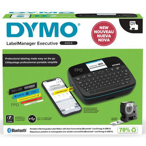 Etiquetadora profesional LabelManager® Executive LM640 CB QWY - Dymo versátil. Etiquetadora portátil y recargable con doble conectividad. Compatible con etiquetas estándar y duraderas D1, y anchuras de 6, 12, 19 y 24 mm. Portabilidad sin esfuerzo gracias a la batería recargable de iones de litio. Diseño que ahorra espacio con dimensiones compactas y superficie texturizada para un agarre ergonómico.