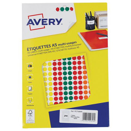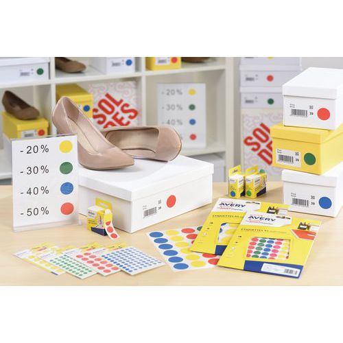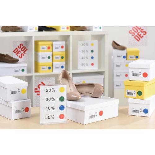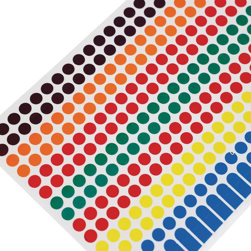 Compatibles con todas las impresoras láser y de tinta. Para señalizar, identificar, clasificar, codificar, localizar de un vistazo. Varios colores y varios diámetros. Adhesivo permanente.