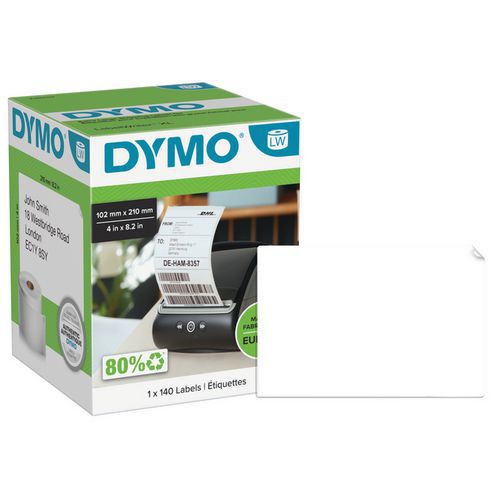 Nuevas etiquetas de envío DYMO® LabelWriter extra anchas con formato DHL de 102 x 210 mm. Satisfacen todas las necesidades de envío de paquetes de DHL, líder del mercado de los envíos a escala mundial. Adhesivo permanente, sin PBA.