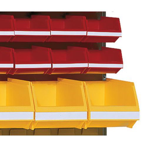 Etiquetas precortadas para cajas con abertura frontal. Solo tiene que deslizar la etiqueta en el portaetiquetas de la caja. Permite la identificación rápida y sencilla del contenido.