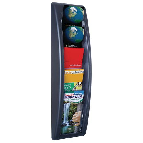 Un auténtico hallazgo para su oficina. Gracias a sus compartimentos transparentes podrá exponer sus folletos de manera clara y ordenada. Para encontrar de un vistazo el folleto que necesita. Caja de 2 cm de grosor con ventanas de poliestireno de cristal. Soporte de poliestireno de color. Se sirve montado. Para fijar mediante tornillos (incluidos).