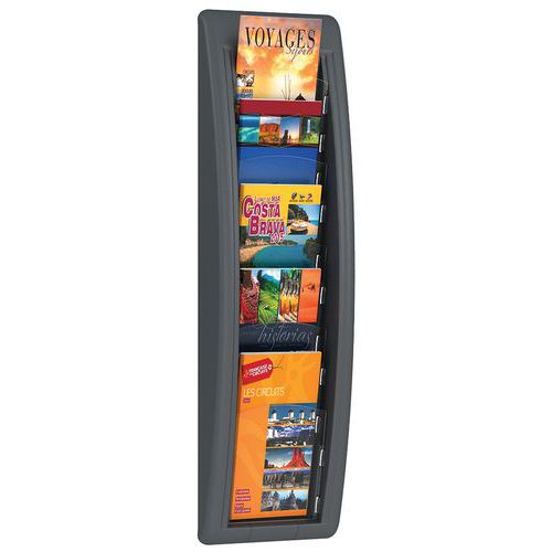 Un auténtico hallazgo para su oficina. Gracias a sus compartimentos transparentes podrá exponer sus folletos de manera clara y ordenada. Para encontrar de un vistazo el folleto que necesita. Caja de 2 cm de grosor con ventanas de poliestireno de cristal. Soporte de poliestireno de color. Se sirve montado. Para fijar mediante tornillos (incluidos).
