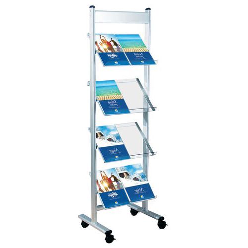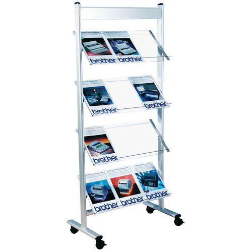 Expositor para folletos con marco de acero. Cuenta con 4 ruedas dobles pivotantes con freno. Baldas de cristal acrílico de calidad superior.