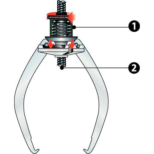 Polivalente: montaje en 2 o 3 garras. Comodidad: extractor de garras de apriete automático mediante resorte de retorno. El extractor se mantendrá en posición sobre la rodadura, aunque no esté en tensión. Seguridad: bloqueo de las garras en posición sobre la rodadura con ayuda de una rueda. Tornillo de cabeza fusible: un pasador se corta en caso de rebasamiento del par admisible. Juego de 3 pasadores de repuesto.