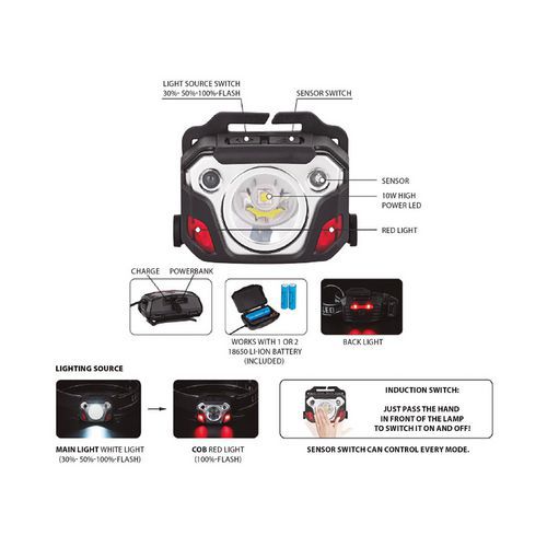 6 modos de iluminación: 4 modos de luz blanca: 30 % de luminosidad, 50 % de luminosidad, 100 % de luminosidad, flash + 2 modos de luz roja (100 % de luz roja y flash).