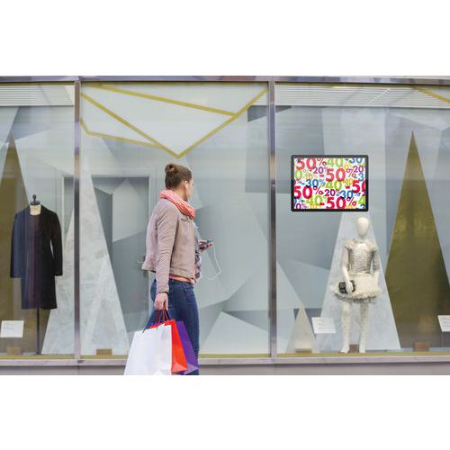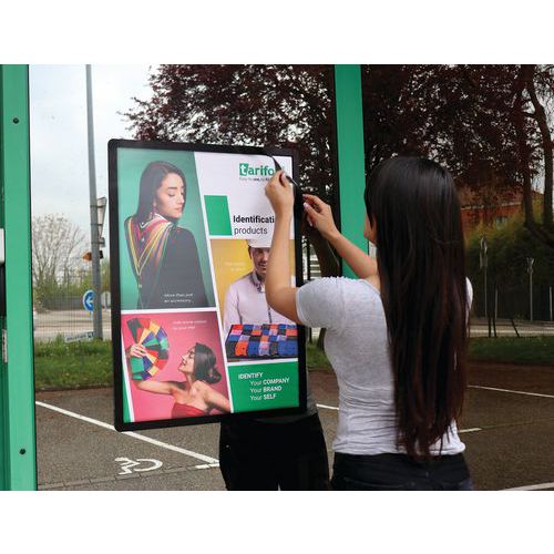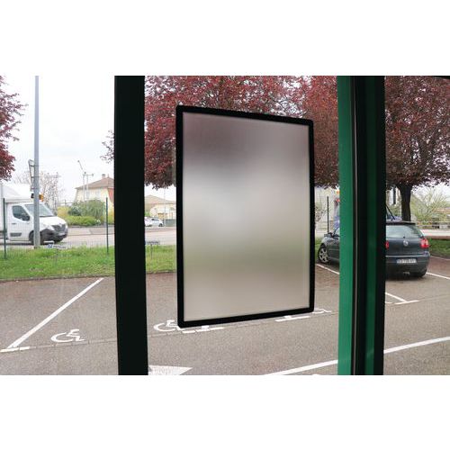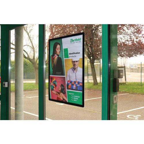 Visualización a doble cara sobre cristal gracias al marco por ambas caras.