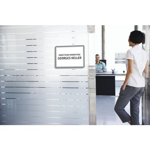 Funda con marco adhesiva con impresión a doble cara, diseño de líneas discontinuas. Cierre mediante 3 bandas adhesivas: sujeción perfecta del documento. Visualización a doble cara sobre cristal gracias al marco por ambas caras. Utilización con doble orientación: vertical u horizontal. Carpeta específica para grandes formatos. Fabricado en la UE