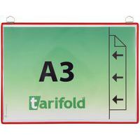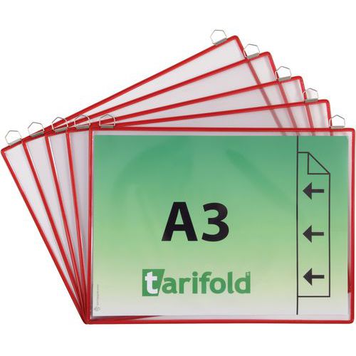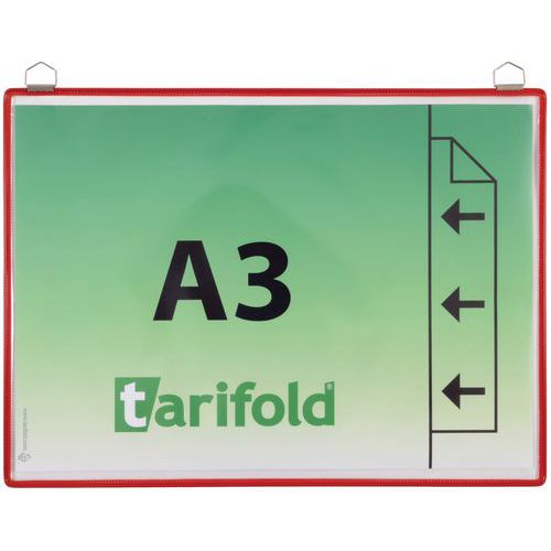 Funda de presentación de colgar para documentos A3, orientación vertical. Marco de alambre de acero irrompible TARIFOLD. Atractivos colores para una presentación temática. Superficie transparente antirreflejos. Asa metálica cromada muy resistente. Para fijación mural. Fabricada en Francia por Tarifold. Una práctica solución para mostrar y enmarcar cualquier tipo de documento A3. Ideal para la exposición en empresas, puntos de información, lugares públicos, pasillos y salas de recepción. Para mostrar documentos permanentes (horarios, normativas, seguridad, evacuación, instrucciones de higiene, etc.).