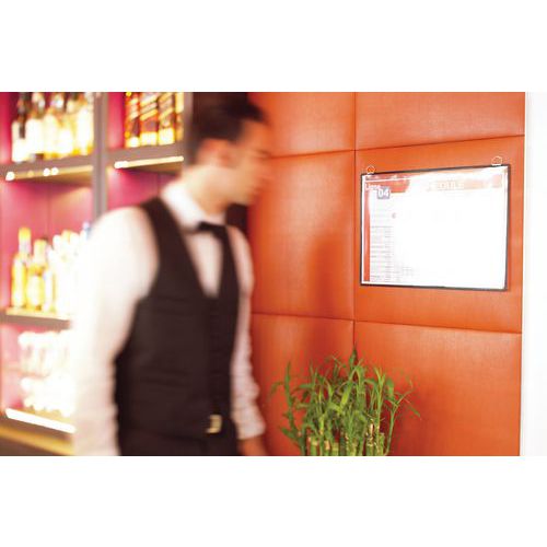 Funda de presentación de colgar para documentos A3, orientación vertical. Marco de alambre de acero irrompible TARIFOLD. Atractivos colores para una presentación temática. Superficie transparente antirreflejos. Asa metálica cromada muy resistente. Para fijación mural. Fabricada en Francia por Tarifold. Una práctica solución para mostrar y enmarcar cualquier tipo de documento A3. Ideal para la exposición en empresas, puntos de información, lugares públicos, pasillos y salas de recepción. Para mostrar documentos permanentes (horarios, normativas, seguridad, evacuación, instrucciones de higiene, etc.).