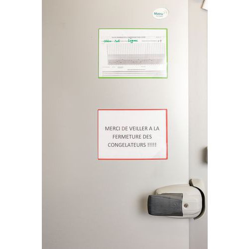 Las fundas magnéticas de visualización Kang Easy Load se fijan a cualquier superficie metálica. El dorso es totalmente magnético y se adhiere perfectamente. Apertura en 2 lados para facilitar la inserción de documentos. Cierre de esquina Easy Load: práctico y eficaz para introducir y extraer documentos. Instalación sencilla y rápida, sin tornillos ni clavos, se retira sin dejar restos. Utilización vertical y horizontal. Solución de visualización para su uso en máquinas, puertas, paneles metálicos, frigoríficos, etc. Funda de PVC con dorso magnético. Puede contener hasta 10 hojas de papel de 80 g. Fondo totalmente ecológico. Fabricado en la UE
