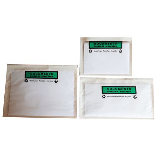 Caja de 1000 fundas adhesivas portadocumentos impresas en inglés y en francés, en papel cristal. Fabricado en la UE