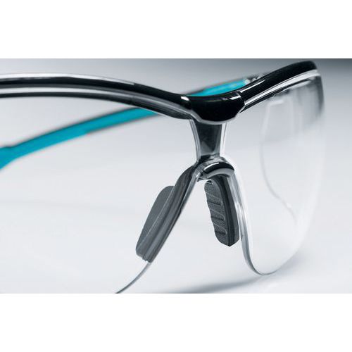Puente nasal ajustable y extremadamente flexible y patillas flexibles y antideslizantes que ofrecen un mantenimiento seguro y sin puntos de presión.