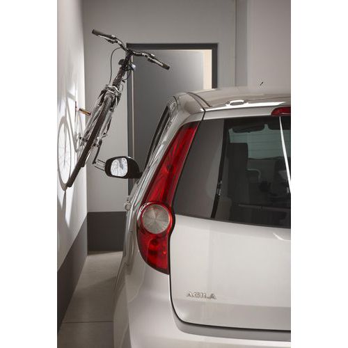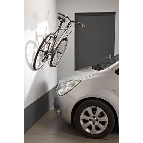 - La bicicleta se sujeta contra la pared para ahorrar espacio.