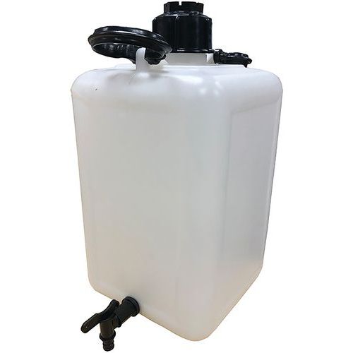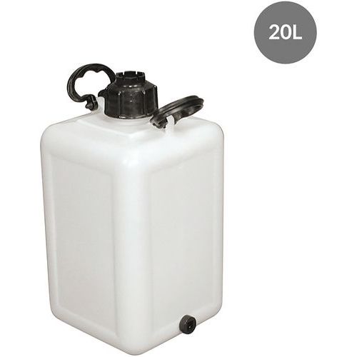 | Nombre del producto | Garrafa con tapón de desagüe, Capacidad: 20 L, Color: Blanco, Longitud: 250 mm, Ancho: 250 mm, Altura: 450 mm |