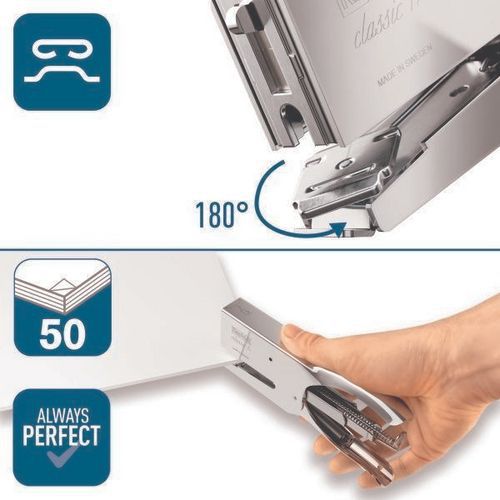 | Nombre del producto | Grapadora Classic K1, Capacidad de grapado (Número de hojas): 50, Longitudes: 182 mm, Ancho: 85 mm |