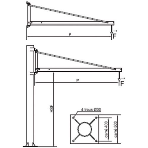 Grúa pivotante con pluma triangular sobre columna, Ángulo de rotación: 210 °, Base Ø: 500 mm, Carga: 100 kg Grúa pivotante con pluma triangular sobre columna, Ángulo de rotación: 210 °, Base Ø: 500 mm, Carga: 100 kg