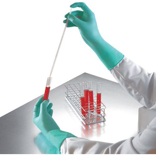 Proporciona una fuerte protección contra salpicaduras químicas de la mayoría de ácidos y alcoholes y certificación de resistencia química EN 374 Tipo B.