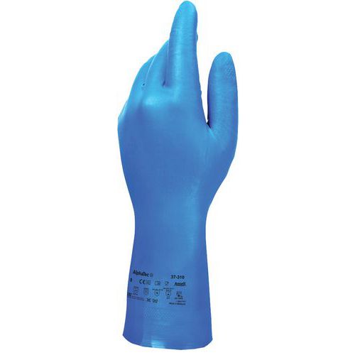 Los guantes PPE AlphaTec® 37-310 ofrecen protección química EN 374 Tipo B contra ácidos ligeros, grasas, aceites y líquidos.