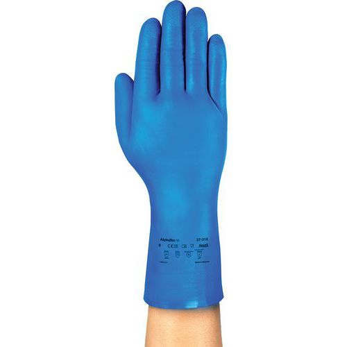 Los guantes PPE AlphaTec® 37-310 ofrecen protección química EN 374 Tipo B contra ácidos ligeros, grasas, aceites y líquidos.