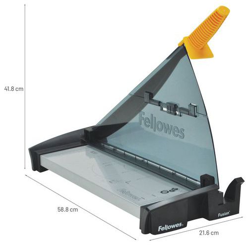 La cizalla Fellowes es fácil de usar gracias a su hoja de acero muy resistente y a su práctico mango. Una pinza manual para el papel reduce el movimiento del papel durante el corte. Ideal para trabajos de corte de hasta 10 páginas. La graduación sobre la base de metal le permite cortar con una precisión excepcional. Estable gracias a sus pies antideslizantes. La cizalla es totalmente segura gracias a la protección extraancha adicional de la zona de corte