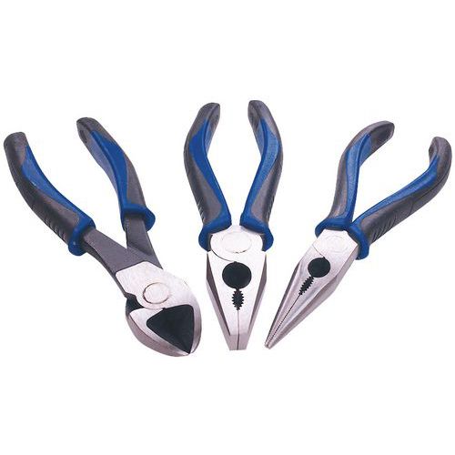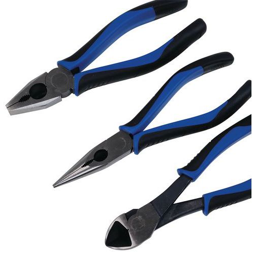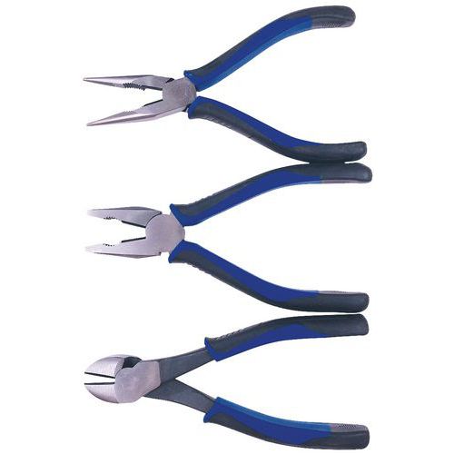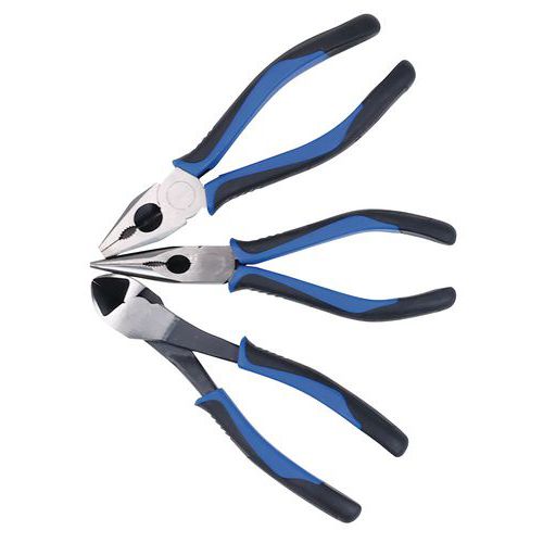 | Nombre del producto | Juego de 3 alicates con asas bimaterial, Nº de piezas: 3, Utilización: Apriete, Material: Acero |