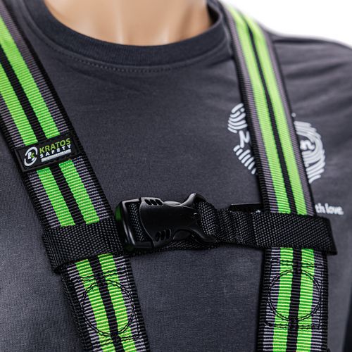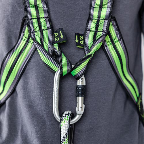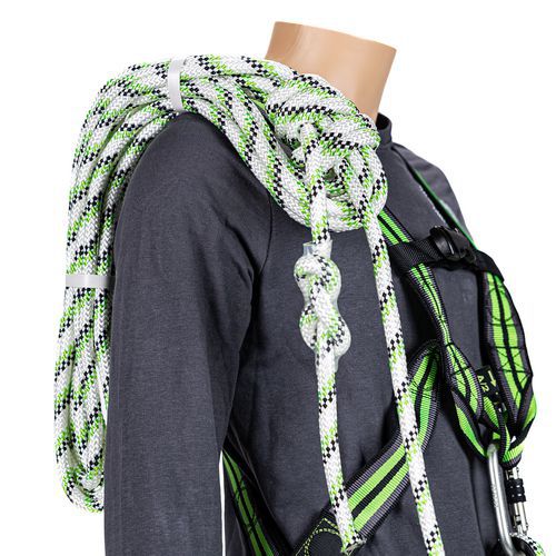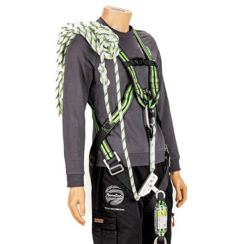 El kit consta de: 1 arnés anticaídas con 2 puntos de anclaje, 1 anticaídas deslizante con absorbedor de energía de 10 m de longitud, 1 conector de acero con cierre de rosca y apertura de 18 mm y 1 bolsa de arpillera.
