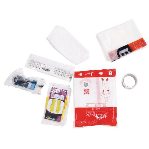 El kit contiene: 1 mono de tipo 5 y 6, EPI de protección individual, categoría III, no tejido 1 par de guantes, amarillos, clasificados EPI 1 semimáscara filtrante plegable, de acuerdo con la norma EN149:2001, clase FFP3 1 par de gafas de acuerdo con la norma EN166 1 par de cubrebotas WeePro 1 bolsa de residuos de 90 x 110 cm, 65 micras, con el logotipo del amianto 1 rollo adhesivo de 48 mm x 33 metros para cerrar la bolsa de residuos y asegurar las uniones entre los accesorios y el mono 1 bolsa con cremallera para meter artículos del kit considerados como residuos después de su uso
