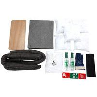 Contiene 30 hojas de absorción, 5 cojines, 3 mechas, 1 par de guantes de protección, 1 combinación de protección de uso único, 2 frascos lavaojos de 500 ml y 2 bolsas de recuperación de desechos.