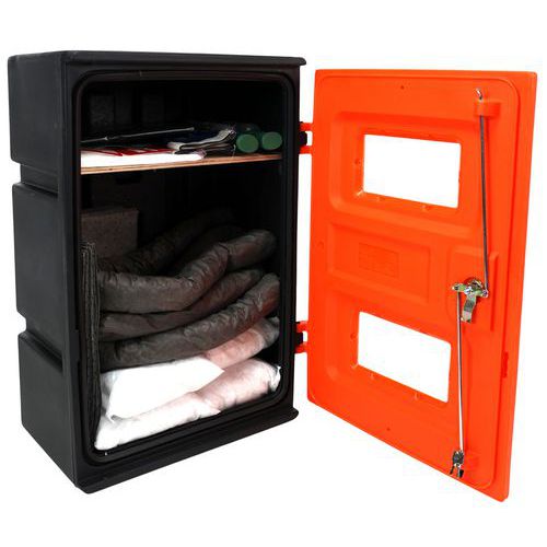 Kit de tamaño mediano que permite una protección completa en caso de accidente con fugas de líquidos. Resistente a la mayoría de los productos químicos y a los rayos ultravioleta, con una junta de goma de grado de automoción y ventanas moldeadas de policarbonato antirrayos ultravioletas. Dos versiones adaptadas al tipo de contaminación encontrada: hidrocarburos o todo tipo de líquidos. Los absorbentes y accesorios son de fácil acceso y claramente visibles. Formato de armario: se puede colgar o dejar en el suelo, puede utilizarse tanto en interiores como en exteriores.
