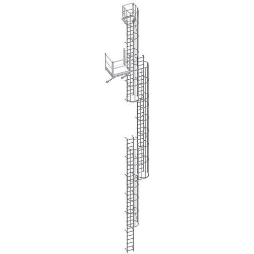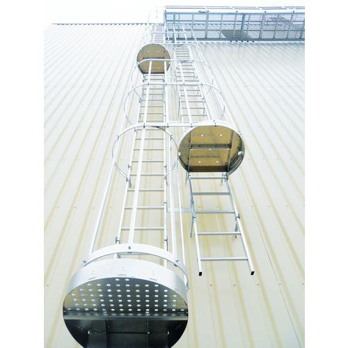 Escalera con protección adaptable a todo tipo de edificios. Aleación de aluminio: excelente relación resistencia/peso. Montaje e instalación rápidos y sencillos. Anticorrosión, de fácil mantenimiento. Escalera con una distancia entre peldaños de 280 mm . Salida frontal con jaula de protección de 1300 mm de ancho.