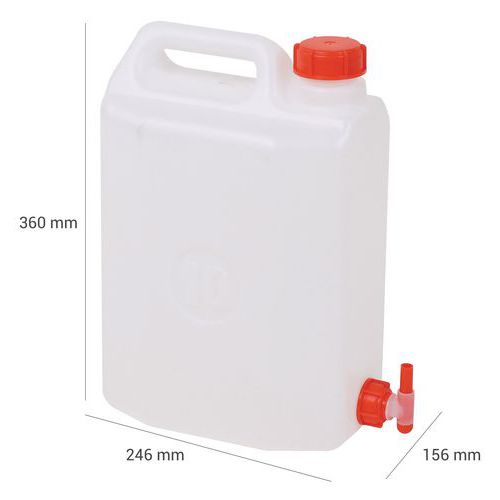 | Nombre del producto | Kit garrafa con grifo, Capacidad: 10 L, Color: Blanco, Longitud: 246 mm, Ancho: 156 mm, Altura: 360 mm |