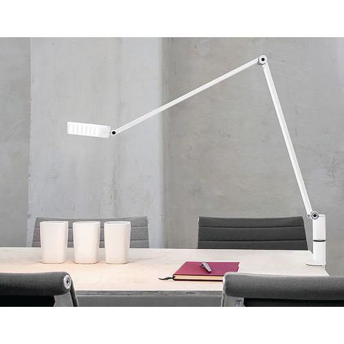 Lámpara de escritorio con LED de diseño muy fino, con elegante brazo articulado de aluminio de 2 elementos y paso de cables invisible. Base en pinza. Potencia de 4000K