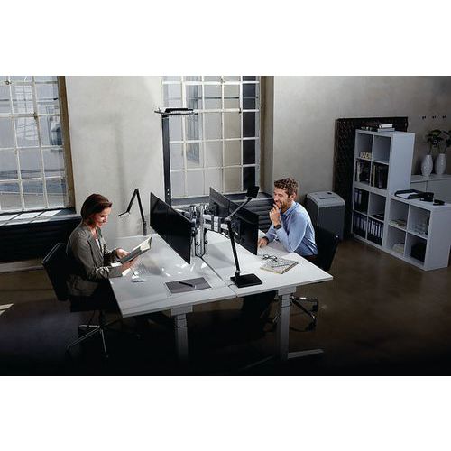 Lámpara de escritorio con LED de diseño muy fino, con elegante brazo articulado de aluminio de 2 elementos y paso de cables invisible. Base en pinza. Potencia de 4000K