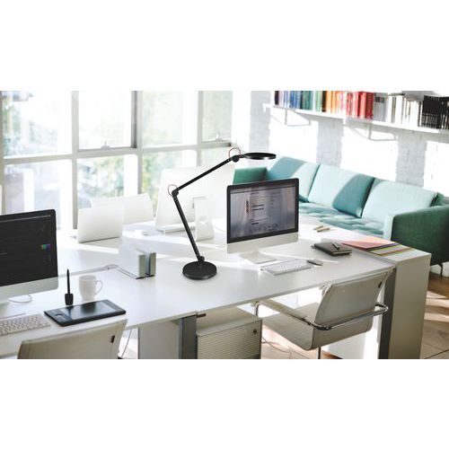 La lámpara de escritorio Giant está equipada con tres articulaciones y dos grandes brazos de 40 cm para una gran comodidad de uso. Un interruptor táctil de intensidad y color le permite iluminar perfectamente su escritorio y cambiar de ambiente luminoso a su gusto. Muy funcional y simple de usar, práctico para la mayoría de personas. Índice IRC superior a 80. Estructura: acero y plástico