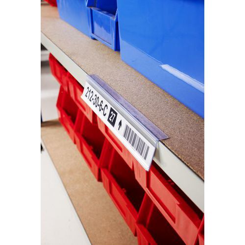 El portaetiquetas autoadhesivo se suspende en una esquina de la estantería para garantizar una visibilidad óptima, lo que permite a los operadores o clientes tener una visión clara de la información que contiene.
