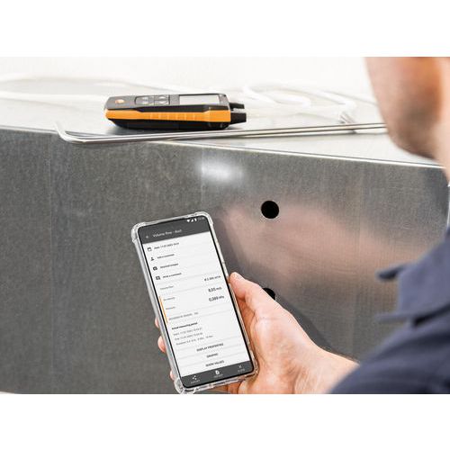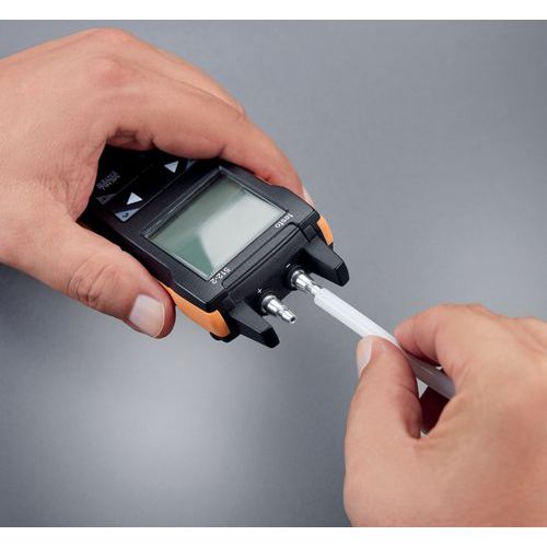 Medición sencilla, rápida y precisa de la presión diferencial (0 … 200 hPa) para controlar los filtros y para la medición mediante un tubo de Pitot en los conductos de aire. Resultados de medición fiables gracias a un sensor de presión diferencial de alta precisión, independiente de la posición. Configuración rápida en la aplicación (canal), curva gráfica, segunda pantalla y memoria de datos de medición en la aplicación testo Smart. Cálculo del caudal volumétrico en el dispositivo de medición y en la aplicación.
