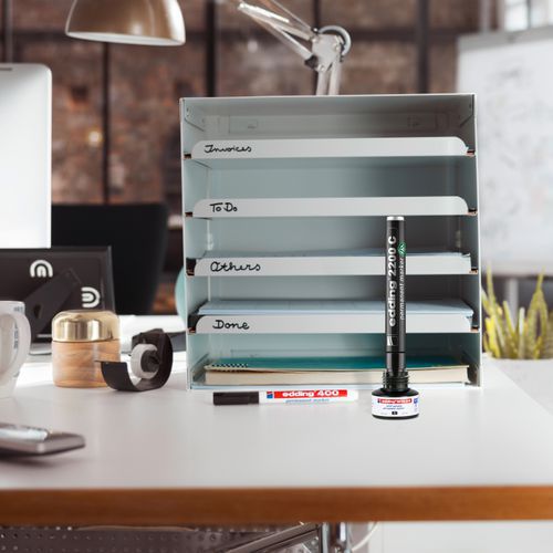 Resistente al agua. Secado rápido. Marcador inodoro. Tinta indeleble no tóxica, sin xileno ni tolueno. Fabricado en Alemania